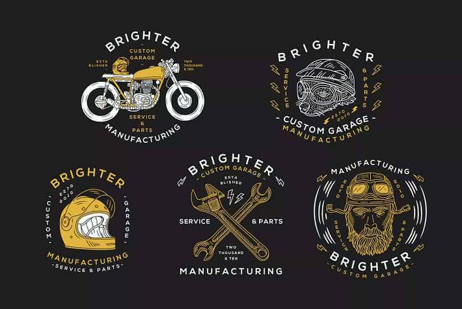 Варианты в пакете с логотипом мотоцикла, представленные выше, прекрасно демонстрируют этот стиль. Сложные детали все еще имеют довольно простые стили, такие как линии или нарисованные от руки элементы.