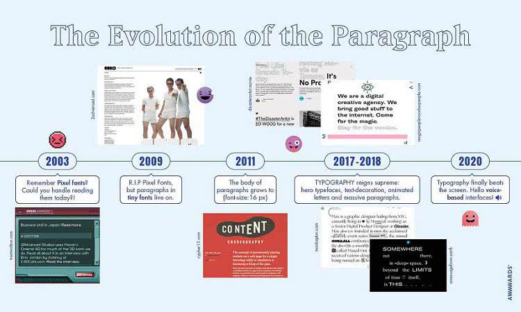 За последние несколько месяцев размер шрифтов и длина абзацев росли с огромной скоростью. Ниже вы можете увидеть иллюстрацию развития оформления абзацев в вебе.