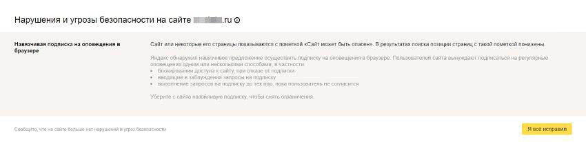 Допустим, сайт получает санкции за нарушения правил поискового продвижения, связанные со спамом («Минусинск», «Баден-Баден», «Дорвей» и другие). Тогда веб-мастеру приходит оповещение в раздел «Нарушения и угрозы безопасности на сайте», и ему нужно исправить нарушения