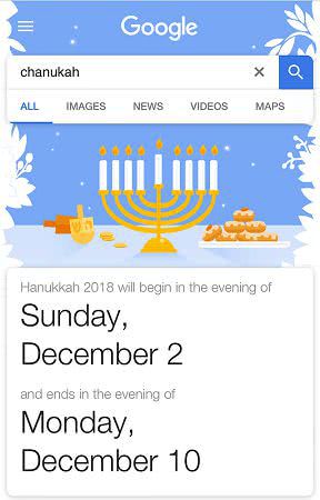 Если ввести в строку поиска слово «Рождество», то выдача Google превращается в заснеженную поляну, на которой Дед Мороз/Санта-Клаус вместе с ребенком наряжают громадную едва гнущуюся зеленую красавицу: Если вас интересует еврейский праздник свечей – Ханука/Hanukkah, то в этом случае поисковая система тоже позаботилась о нужном антураже.