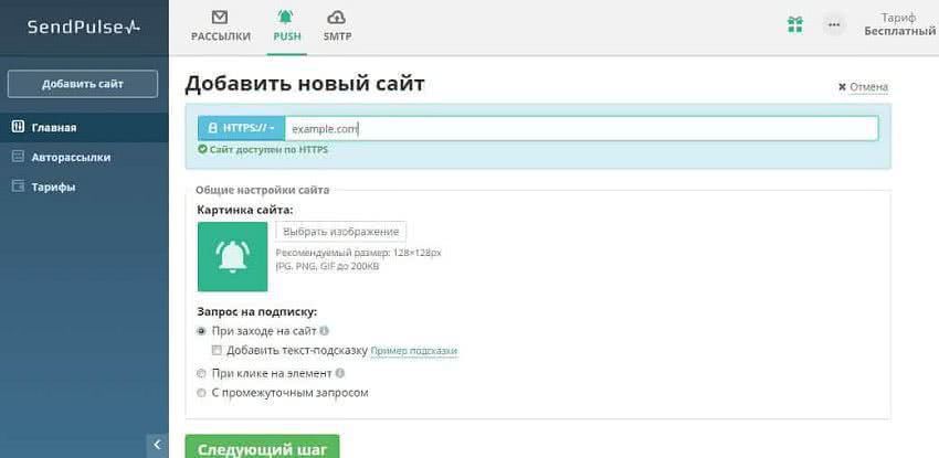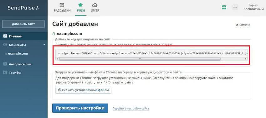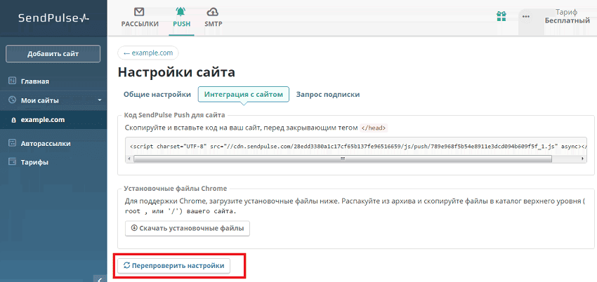 Затем вернитесь в персональный кабинет SendPulse и проверьте настройки сайта.
