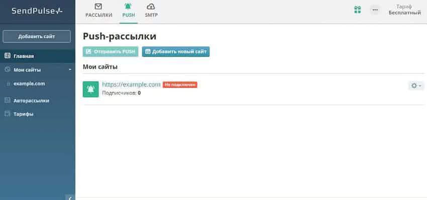 По завершении процесса регистрации вы будете перенаправлены в личный кабинет SendPulse. Самое время добавить ваш сайт! Перейдите в раздел Push и нажмите на кнопку “Добавить новый сайт”.