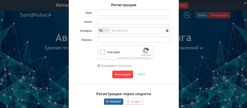 Процесс регистрации в SendPulse займет не более двух минут. Просто нажмите на красную кнопку и войдите в систему с помощью e-mail, или же воспользуйтесь аккаунтом Google или Facebook.