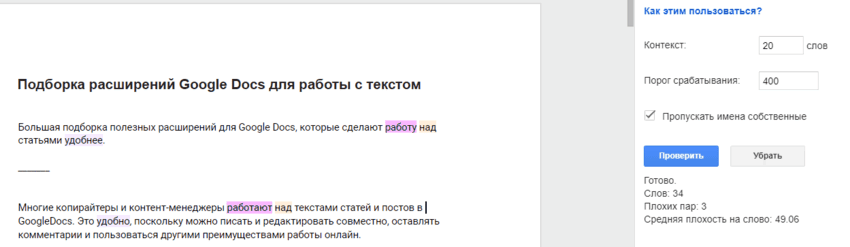Расширение будет полезно тем, кто долго работает над длинным текстом. В таком случае обычно глаз замыливается, и становится тяжело опознать тавтологии.