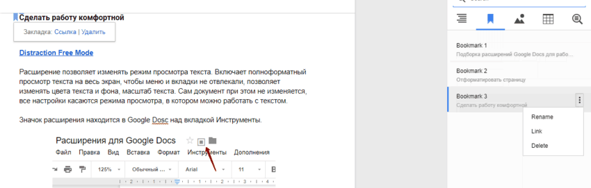 Расширение упрощает навигацию по материалу: определяет структуру по заголовкам, позволяет делать в тексте закладки.