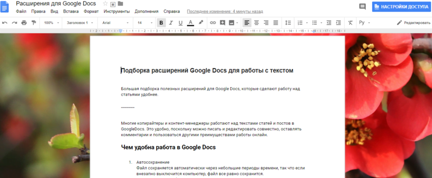 Мы нашли и протестировали расширения для разных функций, облегчающие работу с материалами в Google Docs. Не так давно мы опубликовали несколько таких расширений из каталога Google Chrome в нашей группе в ВКонтакте, и раз материал оказался полезен, собрали большой пакет бесплатных возможностей для разных случаев.