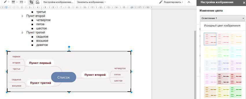 Расширение полезно тем, что бесплатно создает наглядные карты прямо в файле Google Docs. Сами изображения нельзя редактировать, но зато расширение бесплатное, а контент редактируется в формате списка.