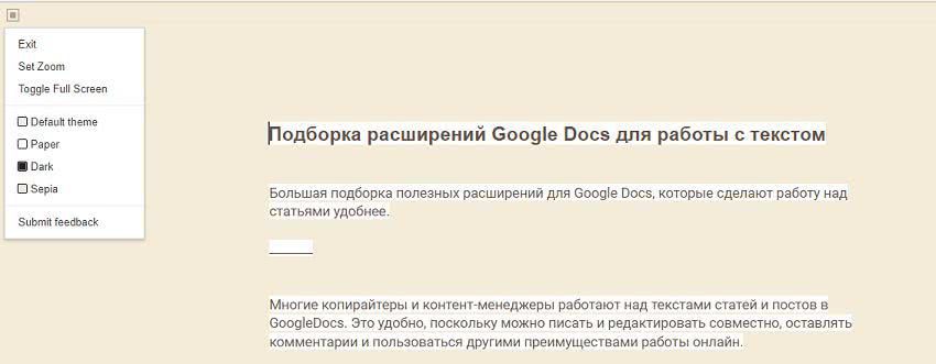 Расширение позволяет изменять режим просмотра текста. Включает полноформатный просмотр текста на весь экран, чтобы меню и вкладки не отвлекали, позволяет изменять цвета текста и фона, масштаб текста. Сам документ при этом не изменяется, все настройки касаются режима просмотра, в котором можно работать с текстом.