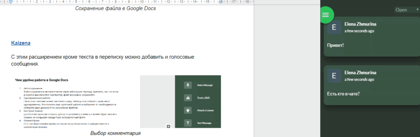В расширении есть чат, куда участники могут писать текстовые комментарии и надиктовывать войсы.