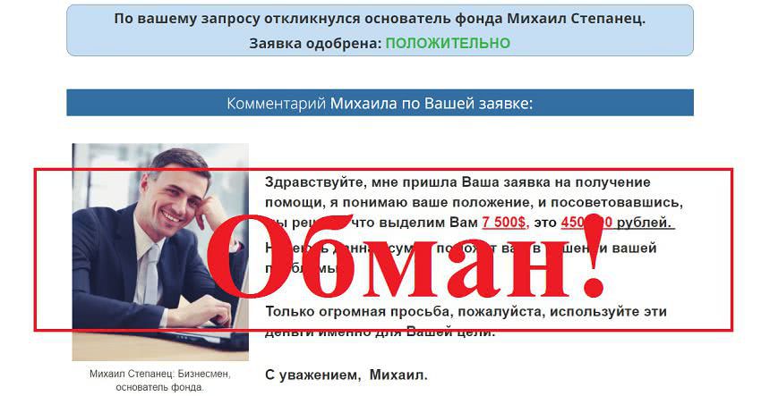 Для получения помощи нужно отправить небольшую сумму в качестве комиссии, а дальше оплатить дополнительные услуги: например, создание банковского счета, куда фонд выполнит перевод. В итоге помощь от фонда так и не придет.