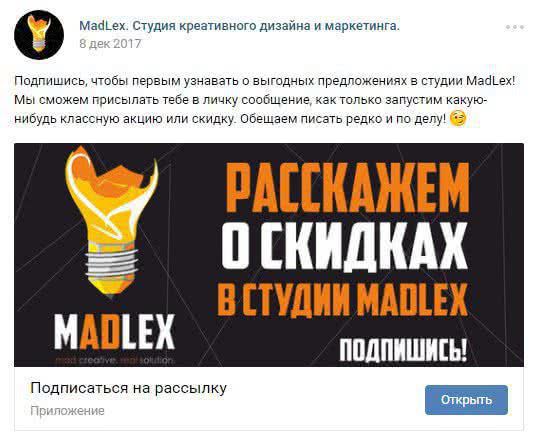 Главное — убедить пользователей, что рассылка полезна и на нее действительно стоит подписаться. Кроме постоянного виджета, админы делают пост на стене с призывами присоединиться к рассылке.