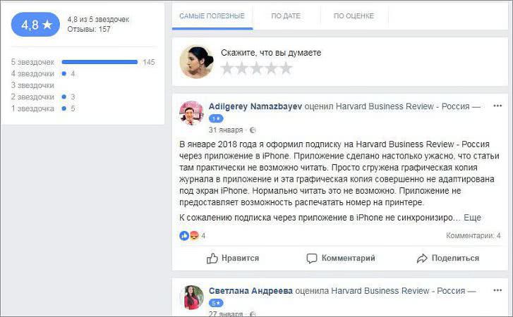 Вкладка с отзывами в Фейсбуке выведена отдельно, она есть во всех шаблонах, кроме "Политики" и "Создатель видео". Их можно включить в настройках шаблона и в любой момент отключить. Отзывы позволяют ставить звезды от одной до пяти, для сравнения ВКонтакте функциональность отзывов не позволяет этого делать. Также другие пользователи могут оценивать отзывы и вступать в диалог. По итогам оценок формируется рейтинг страницы и сводка по отметкам. Всегда лучше, если администрация будет реагировать на отзывы: благодарить за похвалу и решать конфликты.