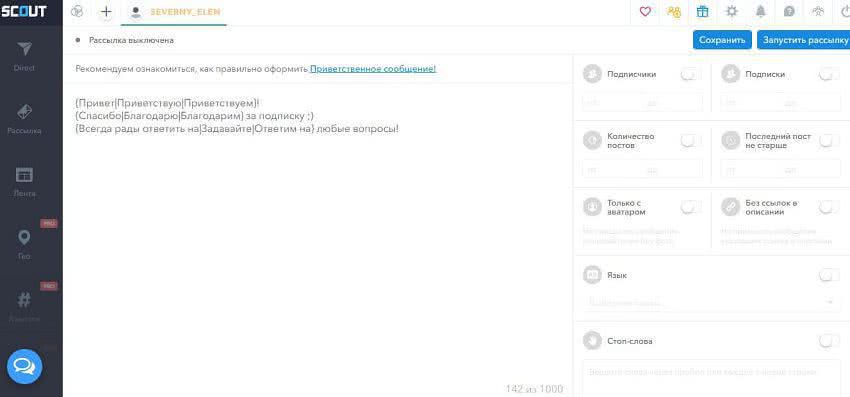 Через сервис можно запускать рассылку по подписчикам, выставив фильтр по количеству постов, наличию аватарки и ссылок, языку, установив стоп-слова и другие фильтры. Само письмо также поддерживает вариативность.