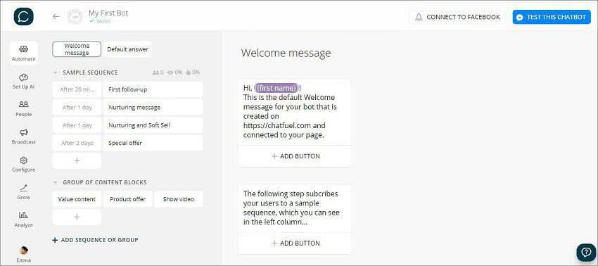 ChatFuel - сервис сразу интегрируется со страничкой Фейсбук, ничего устанавливать не надо. Он умеет создавать блоки из нескольких сообщений с возможностью выбора ответа и перехода к следующему блоку, может привязать к сообщению картинку, галерею и видео, умеет распознавать живую речь пользователей по ключевым словам и знает русский язык, поддерживает встраивание 32-х плагинов в сообщение, то есть можно включить RSS-ленту с сайта и показать свежие статьи блога, вставить таблицы, карты, посты из из Инстаграма или Твиттера.