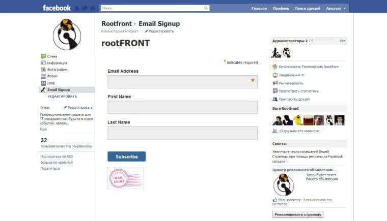 Есть сервис MailChimp, он для e-mail-рассылок, но позволяет размещать на своих Фейсбук-страницах по несколько подписных форм. То есть пользователи не выходя из Фейсбука смогут подписаться на e-mail-рассылку, но подтвердить подписку через e-mail все равно попросят. Это можно сделать, если интегрировать приложение в фейсбук-аккаунт из интерфейса. Для таких форм есть разные темы и дизайны. Форма подписки будет выглядеть также, как аналогичная главенствующая форма подписки для e-mail.