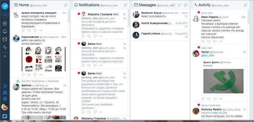 TweetDeck — этот сервис показывает как бы четыре экрана, которые можно пролистывать независимо друг от друга: лента новостей, сообщения, упоминания и активности. Это позволяет не переключать разные вкладки, а смотреть все на одном экране.