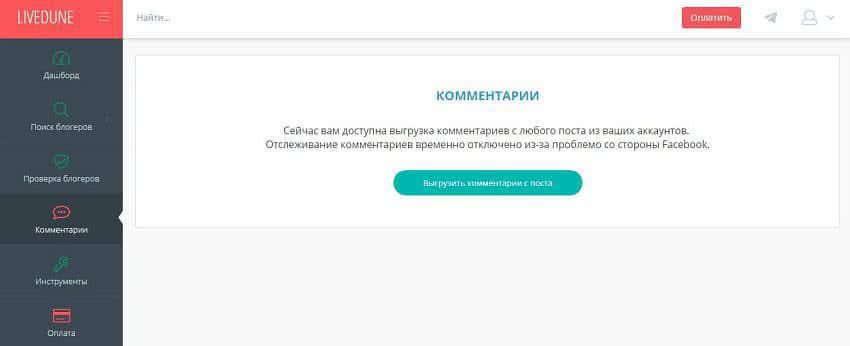 Livedune — этот сервис умеет собирать комментарии и отправлять их для просмотра и ответов в удобный мессенджер, а еще он приспособлен для анализа блогеров и выбора лучшего для заказа у него рекламы. К сожалению, уже довольно долгое время сервис не дает загрузить аккаунт и отследить комментарии, но, возможно, его починят.