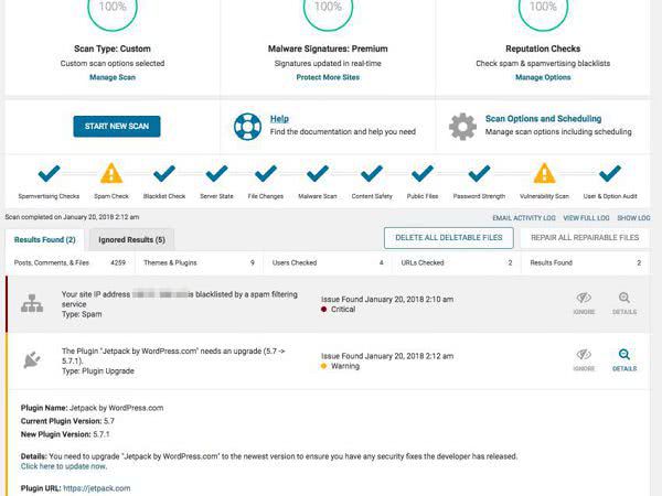 - сравнивает основные темы и плагины с тем, что находится в репозитории WordPress.org и при расхождениях сообщает владельцу сайта;