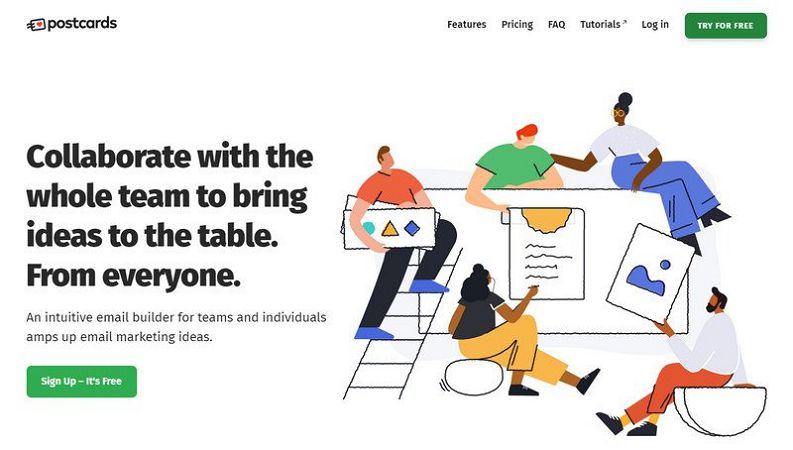 Как и в предыдущем примере, команда, стоящая за Postcards, использует пользовательские иллюстрации, в которых люди выходят на первый план. Они предпочли безликий подход, неидеальные силуэты и даже некоторые причудливые и забавные черты. Все эти несовершенства приближают визуальные эффекты и делают их более привлекательными для онлайн-читателей. Кроме того, динамическая составляющая едва заметна, но она все же добавляет к общему впечатлению.