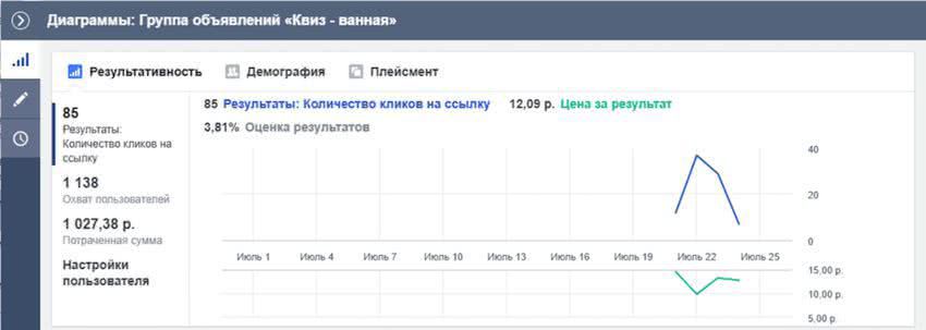 За 2,5 дня потрачено 1 027 рублей, охват — 1 138 человек, 85 кликнули на рекламу с квизом.