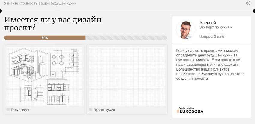 Компания по ремонту и дизайну кухонь предлагает пройти тест, чтобы определиться с кухней мечты и оценить стоимость проекта. Заодно эксперты узнают подробности о кухне и высылают расчет на почту, а за экономию времени специалиста дарят подарки.