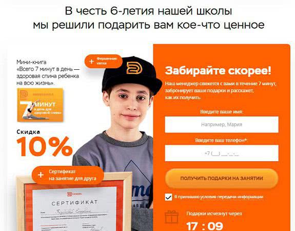 Некоторые квизы рассчитаны на то, чтобы привлечь посетителей на пробное занятие, Тест на сайте детской школы танцев за ответы предлагает подарки и скидки, которые нужно забрать в студии, а заодно и записывают на пробное занятие.