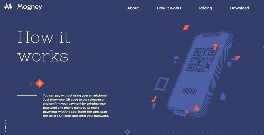 Эта тенденция используется сегодня компаниями, которые предоставляют определенное оборудование или приложения. Одним из примеров является Mogney, приложение для платежей с помощью QR-кода.Они легко и просто описали принцип работы приложения на нескольких слайдах.
