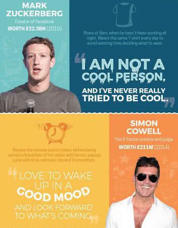 Закончились идеи для вашей инфографики или любой тип контента, если на то пошло? Статьи и обзоры стали запасным вариантом для многих создателей контента. Помимо того, что их легко сделать, они также гарантируют ценность читателям, которые заботятся о главной теме статьи. Хотя контент типа списка также широко используется для инфографики, еще одной продолжающейся тенденцией является обзор цитат от знаменитостей, успешных предпринимателей и других известных людей:  Несмотря на то, что список цитат во многом основан на фактических цитатах людей, для вас еще остается много места, чтобы вы могли проявить творческий подход. Например, в инфографике выше, дизайнеры представили детали, которые отражают карьеру и личность знаменитого человека. Обратите внимание на то, как в разделе Марка Цукерберга есть компьютерная периферия, в то время как иконки, относящиеся к музыке, используются у Саймона Коуэлла.