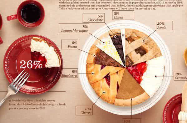 Для некоторой инфографики использование реальных фоновых изображений — отличный способ вызвать эмоциональный опыт у аудитории. Это требует того, чтобы вы выбрали правильную фотографию, дополняющую «атмосферу», которую вы хотите создать. Спросите себя: что я хочу, чтобы моя аудитория почувствовала, просматривая данную инфографику? Должны ли они чувствовать себя вдохновленными, уверенными, сердитыми или голодными? Распространенным примером инфографики, использующей реальные изображения в качестве фона, является «продовольственная» инфографика:  Глядя на инфографику выше, похоже, что создатель хочет рассказать аудитории о сладком мире пирогов. Но, благодаря фоновому изображению, некоторые зрители могут внезапно почувствовать аппетит. Преимущество создания реальной фотоинформации заключается в том, что их удивительно легко создать. Чтобы найти подходящие изображения, вы можете просто загрузить фотографии Instagram или просмотреть фотографии с сайтов, таких как Pixabay. Если вы используете чужое изображение, сначала попросите разрешения. В некоторых случаях они могут даже помочь распространить вашу инфографику после ее выхода в онлайн.