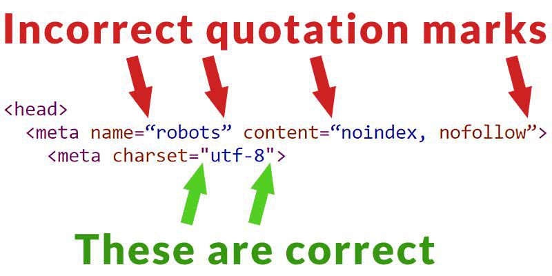 Текстовое оформление мета-тега Noindex в программном коде сайта требует особой внимательности. Достаточно перепутать вид кавычек и Гуглбот не заметит запрета индексации контента. Например, в индексе Google есть сайт: И это несмотря на использование директивы Noindex в HTML-коде: Все дело в том, что указанный фрагмент кода содержит не те кавычки: